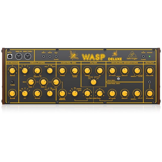 In 1978 a unique and quirky little synthesizer was born. The Wasp, as it was called, was a monophonic, two-octave keyboard that used touch-sensitive keys. It was a novel idea back then but tended to be unreliable and difficult to play. An ultra-affordable homage to that iconic synthesizer, with all the features of the original and then some, the Behringer WASP DELUXE lets you conjure up virtually any sound imaginable with incredible finesse and ease. Pure analog signal path based on authentic VCF and VCA designs in conjunction with a flexible 6-shape waveform LFO including noise and S&H with frequency and pitch modulation control. Having your very own WASP DELUXE is like having your own personal time machine, enabling you to freely embrace the past – or shape the future!