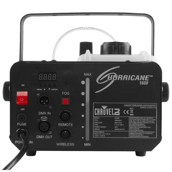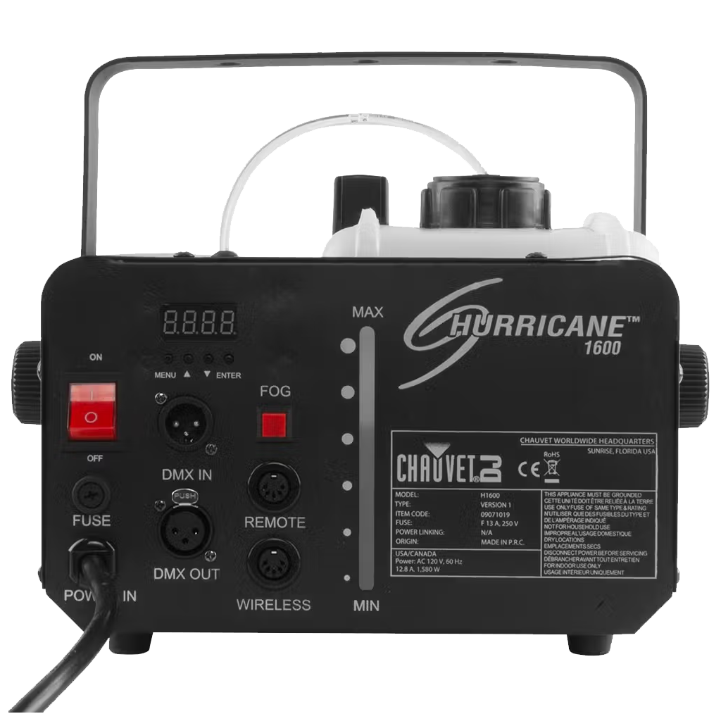 The Hurricane 1600 is a compact, lightweight high output fog machine with DMX control that enhances any light show. Variable output control from DMX or the included timer remote allows for precise effect operation.The Hurricane 1600 features Always Ready technology providing fog on demand. A manual fog button provides easy control at your finger tips and the LED-illuminated tank enhances operation and safety. An advanced fluid sensor, with automatic shut-off protects the pump from overheating. The machine has ultra-fast heat up time for a quick setup and residue-free water based fog output.