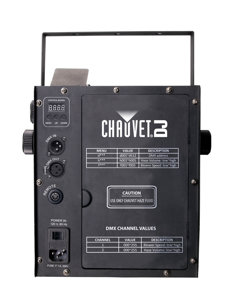 Hurricane Haze 2D is a water-based haze machine with continuous output and a digital display to set DMX and stand alone functions with ease. It features adjustable blower output speeds and nozzle to get the haze where you need it. The low fluid indicator gives a warning before running out of fluid. An included wired, timer remote stores conveniently in the fixture.