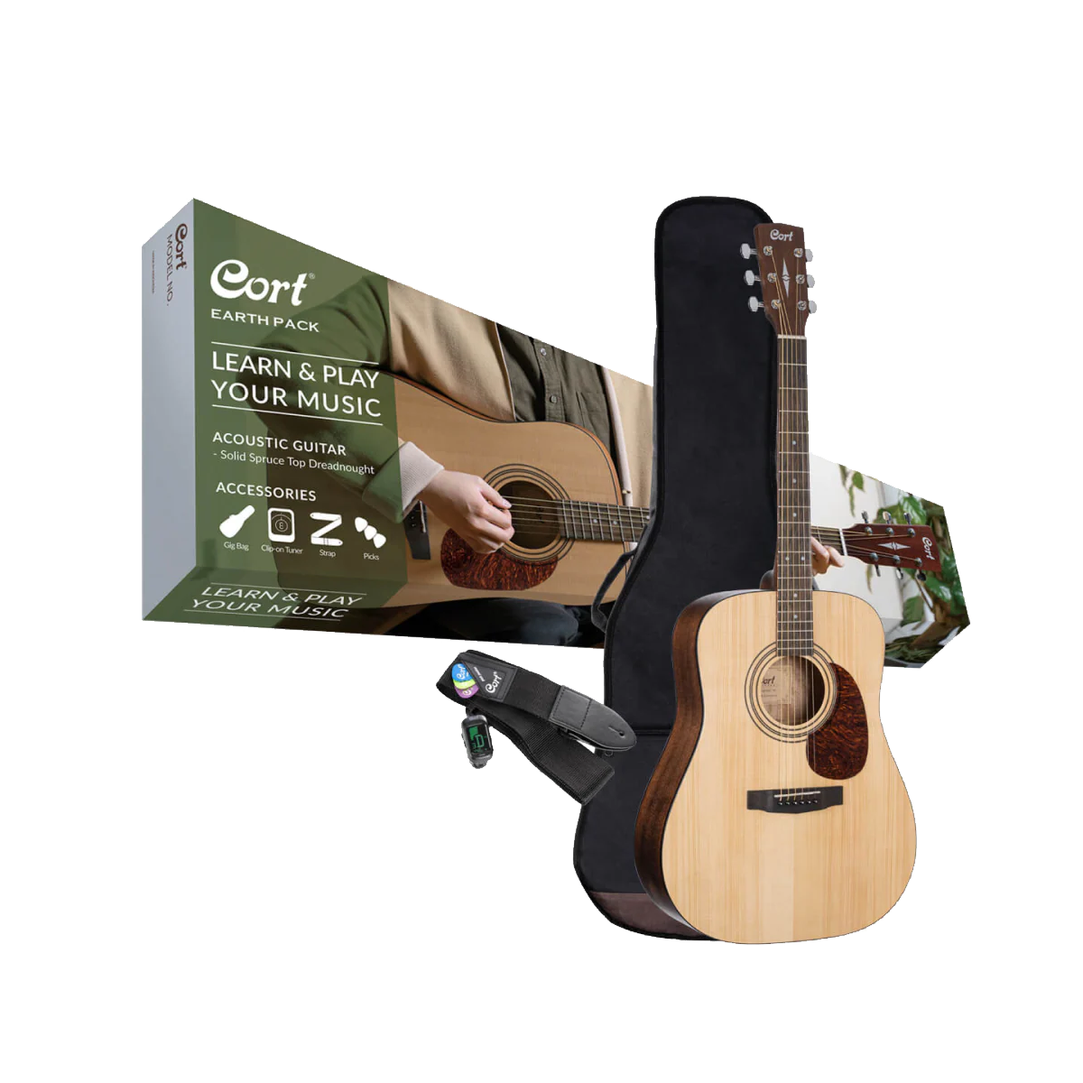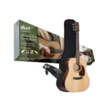 The Earth Pack includes Earth 60 with features that are hard to find in its price range. Earth 60 features a full-sized dreadnought body with solid spruce top and mahogany back and sides for great top end tone and warm, balanced sounds, and is built by the same builders that make Cort’s higher tier models. Also included in the Earth Pack are a spare pack of strings, picks, a gig bag and an electronic guitar tuner to get you playing instantly.