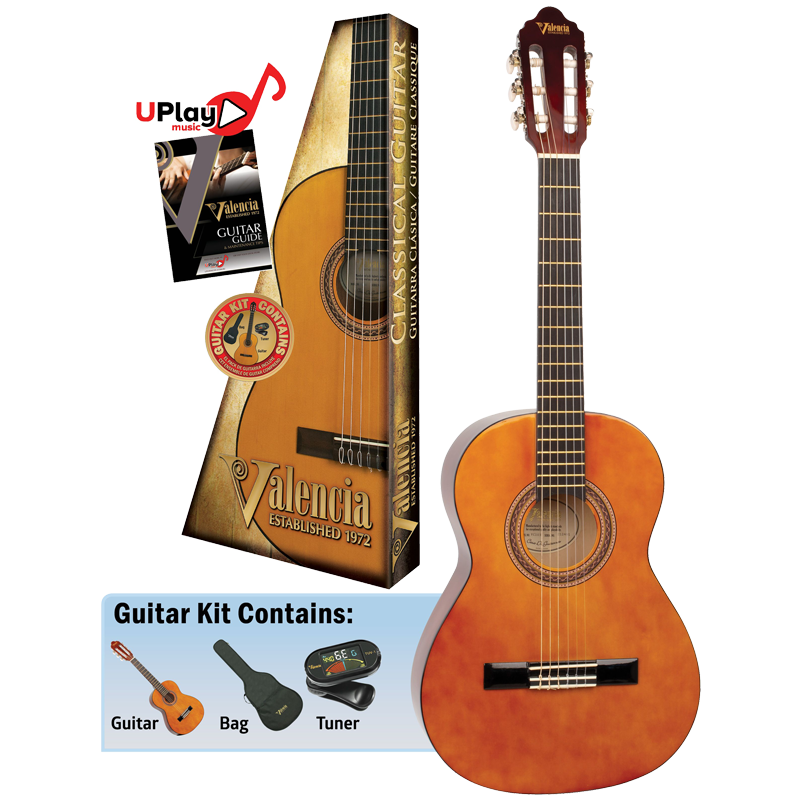 VALENCIA 3/4 size classical guitar. Basswood top, back and sides. ABS black bound body and fingerboard. Nato neck with ebonized hardwood fingerboard and bridge. Traditional nickel machine heads with cream buttons. Supplied with Valencia UPlay Guitar Guide and free online lessons. Full colour display box. Natural gloss.VALENCIA – 3/4 size classical guitar. Basswood top, back and sides. ABS black bound body and fingerboard. Nato neck with ebonized hardwood fingerboard and bridge. Traditional nickel machine heads with cream buttons. Supplied with Valencia UPlay Guitar Guide and free online lessons. Full colour display box. Natural gloss.